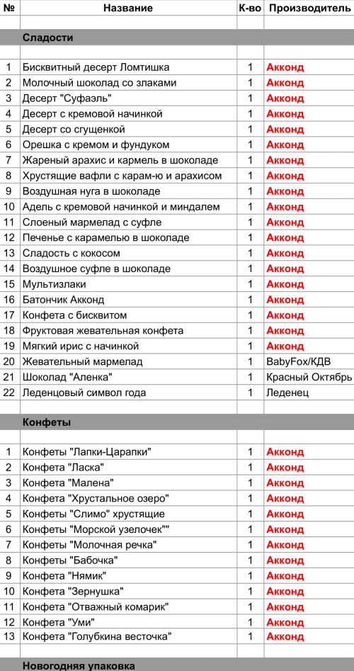 Бисквитный десерт Ломтишка (1 шт), Молочный шоколад со злаками (1 шт),Десерт "Суфаэль" (1 шт), Десерт с кремовой начинкой (1 шт), Десерт со сгущенкой (1 шт), Орешка с кремом и фундуком (1 шт), Жареный арахис и кармель в шоколаде  (1 шт), Хрустящие вафли с карам-ю и арахисом (1 шт), Воздушная нуга в шоколаде (1 шт), Адель с кремовой начинкой и миндалем (1 шт), Слоеный мармелад с суфле (1 шт), Печенье с карамелью в шоколаде (1 шт), Сладость с кокосом (1 шт), Воздушное суфле в шоколаде (1 шт), Мультизлаки (1 шт), Батончик Акконд (1 шт), Конфета с бисквитом (1 шт), Фруктовая жевательная конфета (1 шт), Мягкий ирис с начинкой (1 шт), Конфеты "Лапки-Царапки" (1 шт), Конфета "Ласка" (1 шт), Конфета "Малена" (1 шт), Конфета "Хрустальное озеро" (1 шт), Конфеты "Слимо" хрустящие (1 шт) ,Конфеты "Морской узелочек" (1 шт), Конфеты "Молочная речка" (1 шт), Конфеты "Бабочка" (1 шт), Конфета "Нямик" (1 шт), Конфета "Зернушка" (1 шт), Конфета "Отважный комарик" (1 шт), Конфета "Уми" (1 шт), Конфета "Голубкина весточка" (1 шт)
